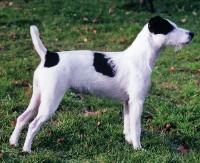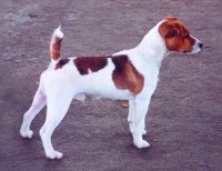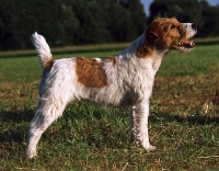 | Der Standard unterscheidet beim Haarkleid Rauhaar und Glatthaar. Beim Rauhaar gibt es noch die Variation „Broken-coat”. Diese gelten jedoch nicht als verschiedene Schläge, weshalb rauhaarige und glatthaarige Hunde beliebig miteinander angepaart werden dürfen. Aus diesem Grund befinden sich bei nahezu allen PRT sowohl rauhaarige als auch glatthaarige Vorfahren in der Ahnentafel. Es ist deshalb auch nicht selten, dass in einem Wurf sowohl rauhaarige als auch glatthaarige Welpen liegen. Eine zuverlässige Vorhersage der Haarart ist deshalb für den Züchter vor dem Wurftermin überhaupt nicht möglich. Bei den Welpen selbst kann man mit geübtem Auge nach ein paar Wochen zumeist die Haarart erkennen. Sichere Zeichen für Rauhaar sind neben der größeren Länge des gesamten Fells vor allem einzelne lange weiße Haare, welche gut sichtbar in braune oder schwarze Flecken am Kopf oder am Körper hineinreichen. Außerdem sieht man mit etwa fünf Wochen oft auch schon einen gewissen „Bartansatz”, welcher ebenfalls nur bei rauhaarigen Hunden auftritt. Es kann allerdings selbst dem erfahrenen Züchter in Einzelfällen passieren, dass er einen Welpen mit acht Wochen als glatthaarig ansieht, der sich hinterher ausgewachsen als Hund mit knappem Rauhaar herausstellt. |  |